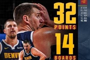 本场比赛,掘金球星约基奇在32分钟的时间里,投篮14中10,三分球1中1,罚球12中11,砍下32分14篮板14助攻1抢断。