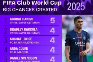 体育资讯7月11日讯 本届世俱杯仅剩巴黎vs切尔西的决赛,数据机构squakwa也统计了本届赛事创造重大机会情况,边后卫阿什拉夫居首。