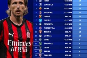1、米兰(15人):总身价3.58亿欧元