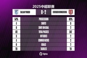 大连英博本场4射0正,射门数和射正数都创下球队单场中超新低